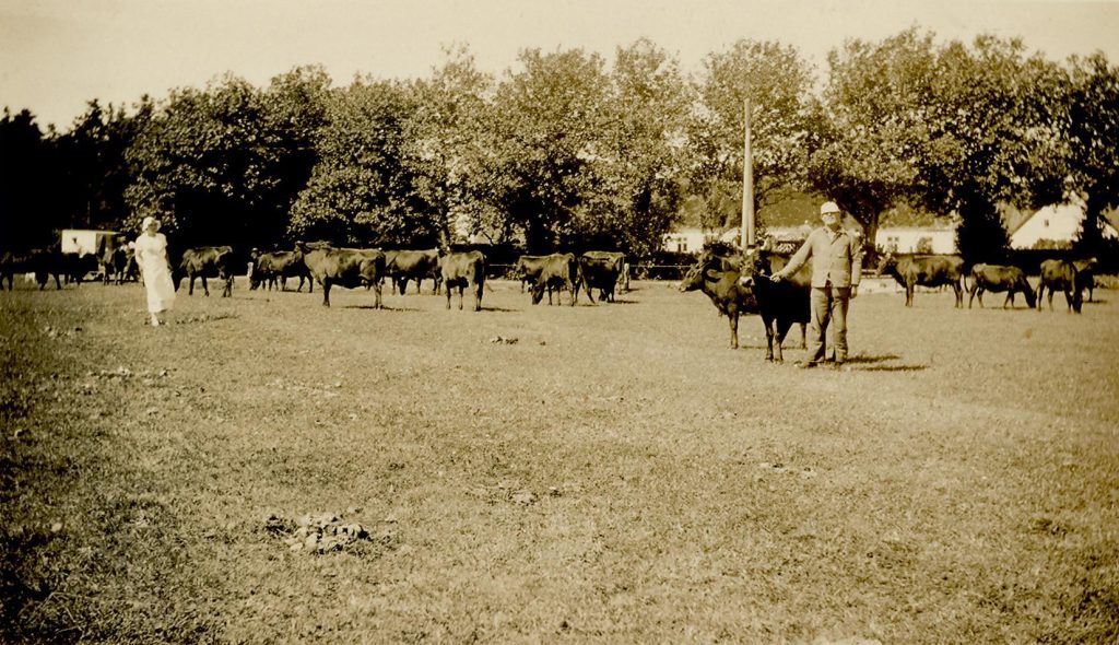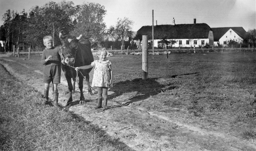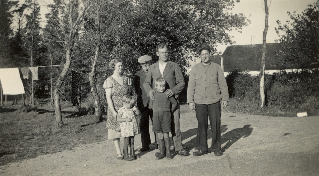 Gårdejer Jørgen bor selv på St. Gøgsig (bagerst med kasket). De øvrige personer er medhjælpere hvis navne er fundet i folketællingen fra 1940. Jens Mikkelse – fodermester, S…ilis Mikkelsen – husgerning, Karl Aage Mikkelsen – Barn, Karen Inga Mikkelsen – Barn og Karl Nielsen Kyk – Arbejdskarl