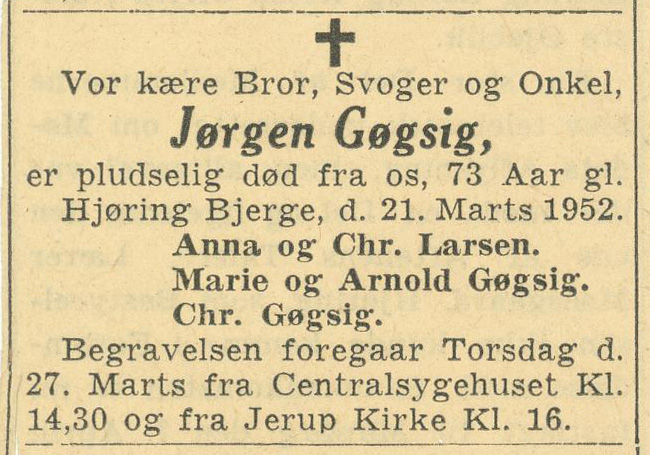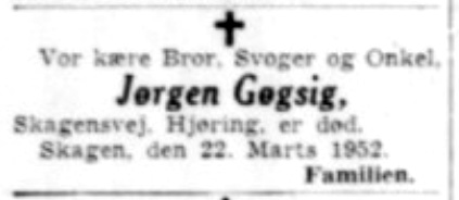 Jørgen Gøgsig og Ingrid Pedersen. Det vides ikke rigtigt hvem Ingrid Pedersen er, men Jørgen og Ingrid er begge fra Tversted, og de købte i fællesskab i 1944 huset Højbo Hjørring Bjerge (Vendsyssel tidende 08/05 -1944).