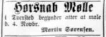 I følge Vendsyssel tidende d. 1909-11-04 begyndte Horsnab Mølle igen at male korn.