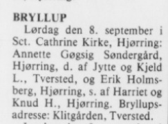 (L20). Annette Gøgsig Holmsberg (f. 15. april 1959 ) gift lørdag d. 8. september 1984 i Sct. Cathrine Kirke, Hjørring med Erik Holmsberg (f. 25. august 1955).