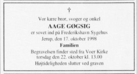 Aage Gøgsig døde på Frederikshavns Sygehus den 17. oktober 1998 i en alder af 85 år.