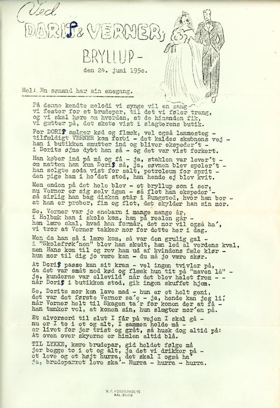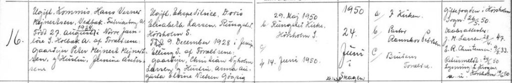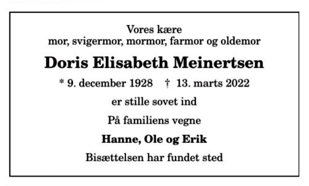 Doris Elisabeth Larsen blev d. 24. juni 1950 gift med Hans Verner Meinertsen.