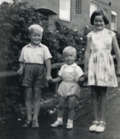 Ole, Erik og Hanne fra ca. 1957. Fotografiet er taget foran boligblokken på Skodsborgvej 350.