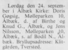 (L09). Doris Margrethe Nielsen-Gøgsig (f. 13. juli 1959 – d. ) blev d. 24. september 1988 gift med Jens Nilsson (f. 14. januar 19xx – d. ).