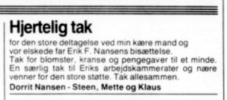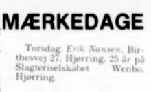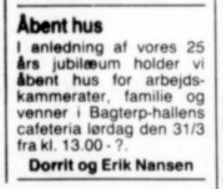 I 1990 havde Erik Nansen 25-års jubilæum på Slagteriselskabet Wenbo Hjørring. Dorrit må også have haft 25-års jubilæum på Oxford kiksfabrik, for de holder begge to åbent hus for arbejdskammerater, familie og venner i Bagterp hallens cafeteria, lørdag d. 31. marts 1990.