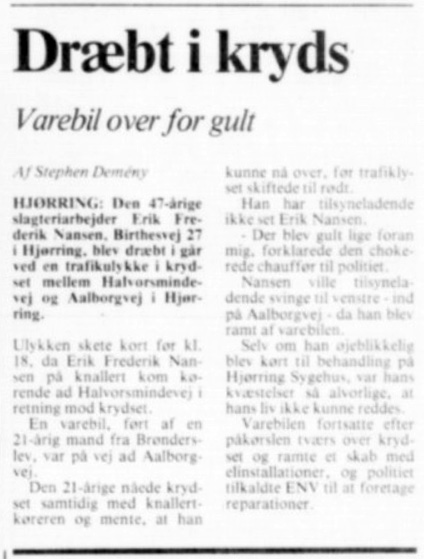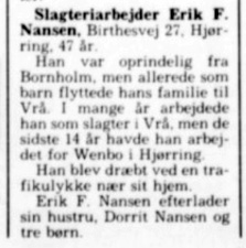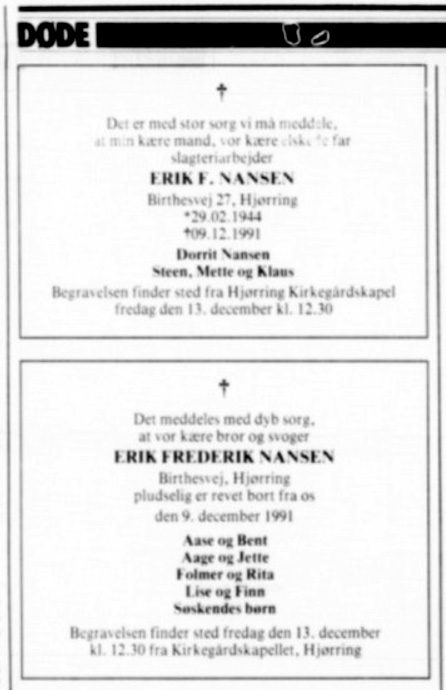 Den 10. december 1991 får idyllen i huset på Birthesvej en brat ende. Erik på 47 år bliver dræbt på sin knallert af en varebil, der kører over for gult på Aalborgvej, ikke langt fra hjemmet. Steen er på det tidspunkt 26 år, Mette er 16 år og Klaus er 12 år. Det var selvfølgelig et kæmpe tab for familien, men Dorrit fortsætter med at arbejde og bliver boende i huset på Birthesvej.