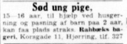 Da Steen var to år gammel annoncerer Rahbæk i Vendsyssel tidende efter en sød pige til hjælp ved husgerning og pasning af et barn på to år. Der var sikkert rigeligt at se til i hjemmet. Der blev bedre plads i Korsgade da Carsten og Ingrid blev gift, og flyttede til Amerika.