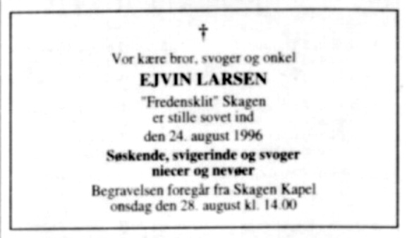 Ejvin blev begravet på Skagen Assistents Kirkegård i 1996.