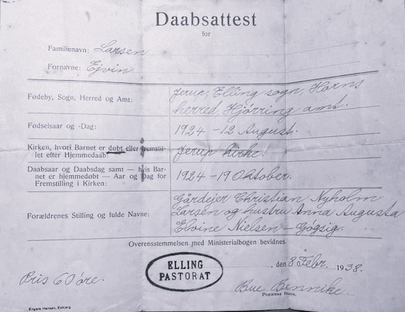 Ejvin Larsen bærer ikke navnet Gøgsig som hans broder Peter Gøgsig Larsen. Han blev født den 12. august 1924 i Elling Sogn, på gården ”Ledet” lidt nord for Jerup,.
