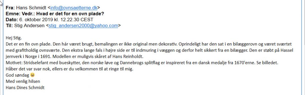 Sofias onkel Stig var med til brylluppet, og han fattede stor interesse for ovnpladen. Han blev så interesseret at han sendte en mail til Ovnsætterne i Christiansfeld. Her er deres svar.