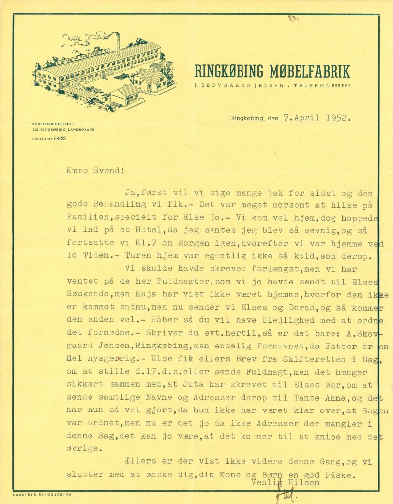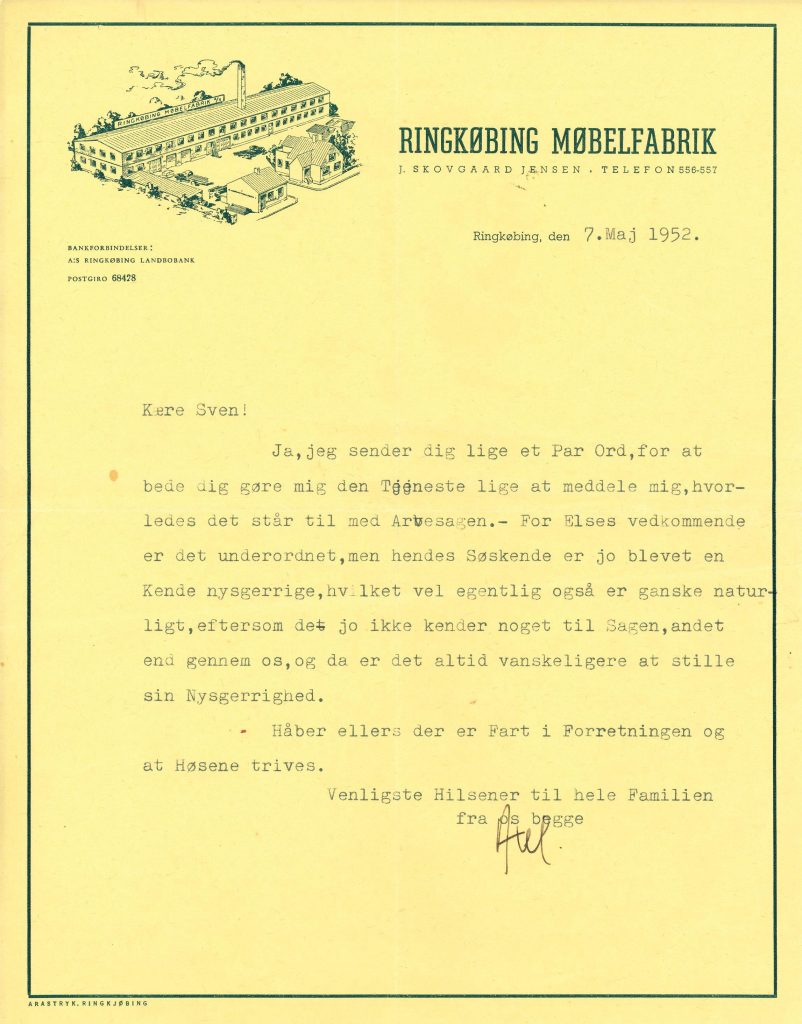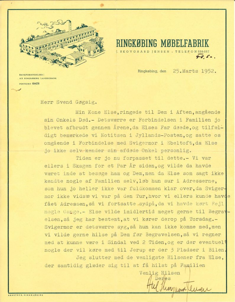 Arvesagen efter Jørgen Gøgsigs død i Hjørring, afstedkom i 1952 følgende brev fra Else/Axel til Købmand Svend Gøgsig i Sindal. Else boede på det tidspunkt på Møllevej 9 i Ringkøbing.
