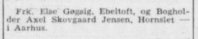 Ungkarl, Bogholder Aksel Skovgaard Jensen f. 6. Marts 1925 i Hornslet Randers Amt. Søn af stolefabrikant Jens Laurits Jensen og Hustru Rasmine Petrea Rasmussen blev den 6. december 1947 gift i vor frue kirke i Aarhus med Husassistent Else Marie Nielsen-Gøgsig f. 13. juni 1924 i Dråby Ebeltoft Randers Amt. Datter at mejeribestyrer Theodor Maurid Nicolaj Nielsen-Gøgsig og hustru Karen Margrethe Søndergaard Grandjean.
