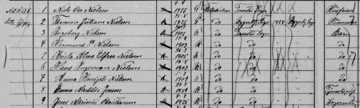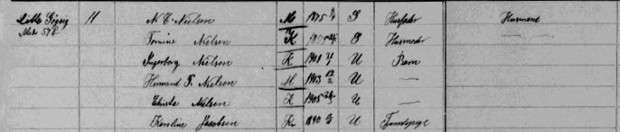 Niels Christian og Thomine bor stadig på Lille Gøgsig. De har nu 7 hjemmeboende børn: Ingeborg, Herman, Christa (her skrevet som Christian), Hans, Anna, Kaj (her skrevet som Karl) og Tage. De bruger alle efternavnet Nielsen.