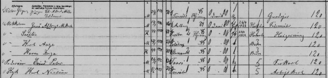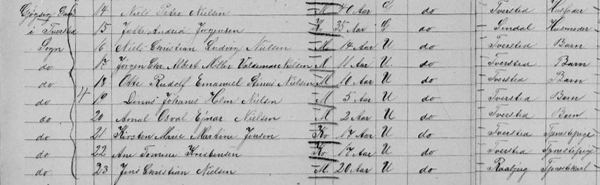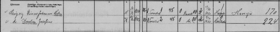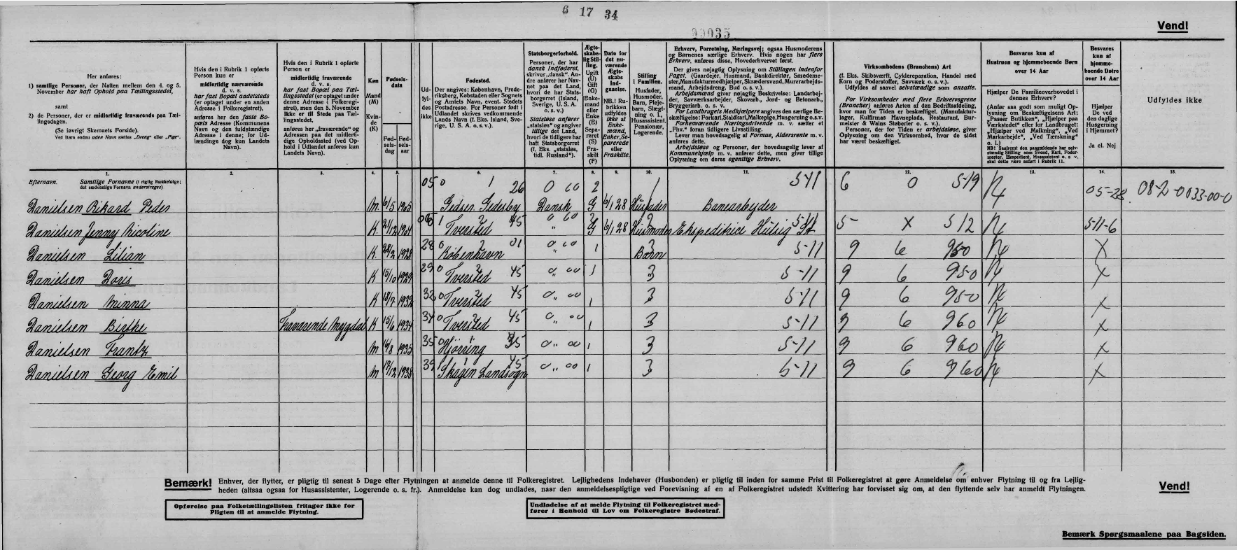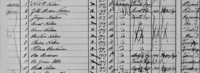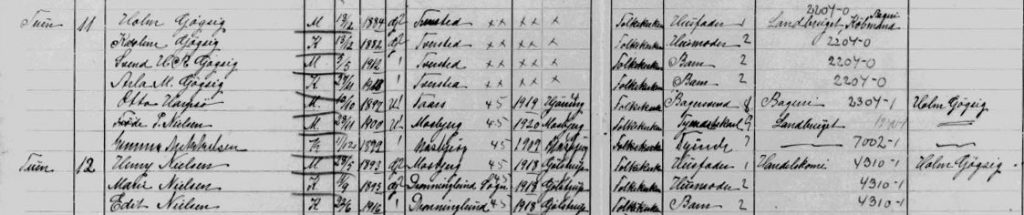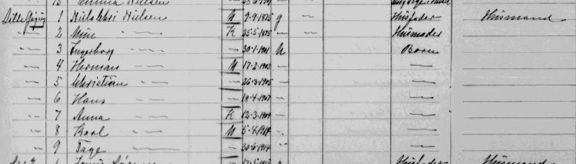 Udklip fra folketællingslisterne er reduceret så de kun viser det mest interessante indhold.