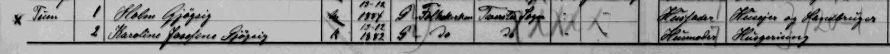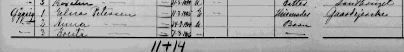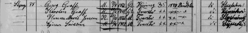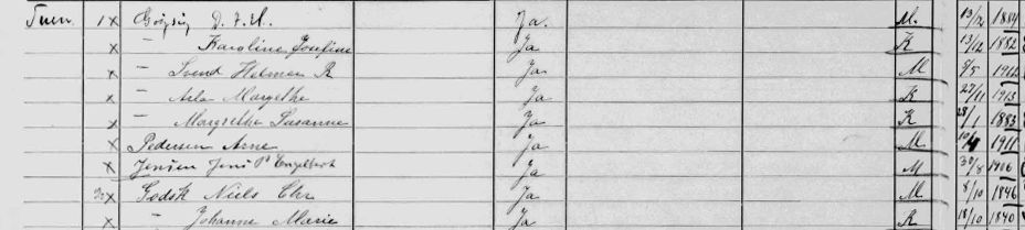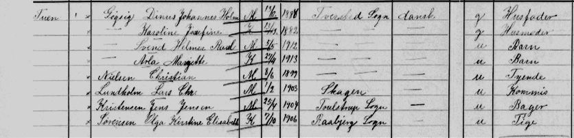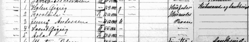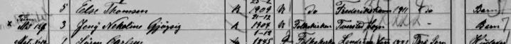 Karoline bragte barnet Jenny Nikoline Andersen med ind i ægteskabet, da hun blev gift med Holm Gøgsig, men de havde tilsyneladende ikke barnet boende, eller også er det bare indskrevet et andet sted i folketællings listen ved et uheld. Barnets navn er her registreret som Jenny Nikoline Gjögsig.