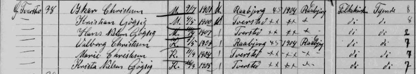 Christian Nielsen-Gøgsig og Valborg bor stadig på gården ”Østenkjær” sammen med deres 4 børn: Elly, Knud, Povl og Harry (bruger kun mellemnavnet Peter). Jytte er endnu ikke født. De bærer alle navnet Gøgsig.