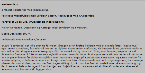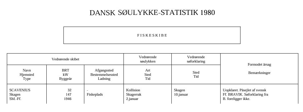 Georg skulle fiske meget for at få råd til det hele. Men maskinen gik i stykker og den kostede mange penge. Så skulle han ud og fiske endnu mere. Det gjorde han også, han kunne fiske. Anden nytårsdag 1980 kolliderede ”Scavenius” med et tre gange så stort Svensk fartøj. Der skete stor skade på Scavenius men skibet kunne dog selv sejle i havn. Det medførte et stort reparationsarbejde inden skibet igen kunne komme ud og sejle.