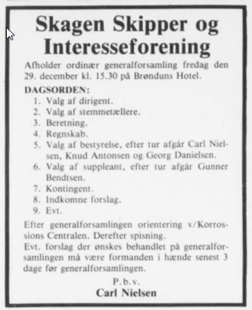 Georg kom med i bestyrelsen for “Skagen Skipper og Interesseforening”. I forening sidder der altid nogle ældre der alle har haft deres skib. De sidder og holder mange bestyrelsesmøder uden der egentligt var brug for det. De sidder på Brøndum med en snapsflaske ved hver kuvert. Georg sad og brændte for at komme ned og passe skibet. På det tidspunkt var han kun nogen og 20 år og havde fået eget skib. Der skulle tjænes penge.