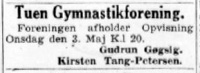 Gudrun var stadig aktiv i Tuen Gymnastikforening. Hun indbyder i Vendsyssel Tidende til gymnastikopvisning onsdag den 3. maj 1950 kl. 20.00.