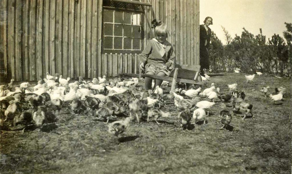Gudrun fodre hønsene medens Sinne ser på i baggrunden.