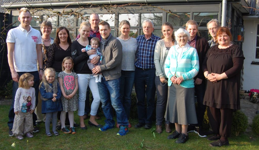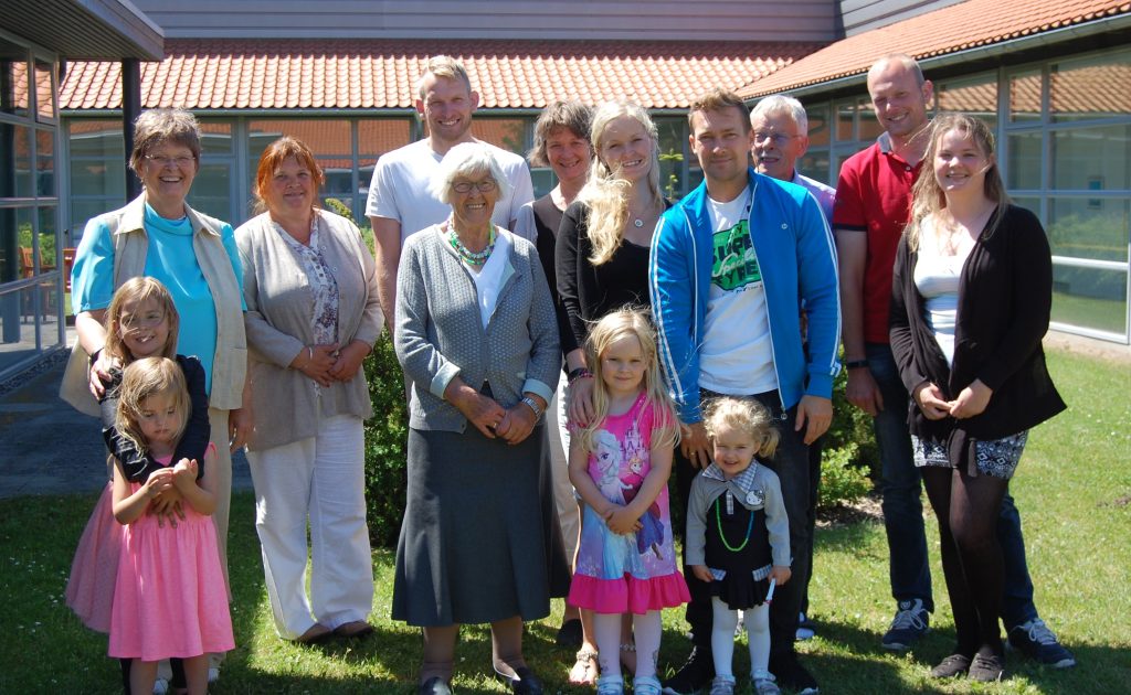 Fra 2016, hvor Gudrun blev 89 år. Fra venstre Lene med Allans børn Mille og Leise. – Mari-Ann – Gudrun – Allan. Ved siden af Gudrun står Sinne’s datter Clara, Sinne står bag hende og Jane bag Sinne. Ved siden af Sinne er det hendes mand Jørgen med deres datter Camille. Bag Jørgen er det Kurt. og sidst Jakob og Heidi. Desværre mangler Jane’s mand Ole og Mari-Anns datter Astrid.