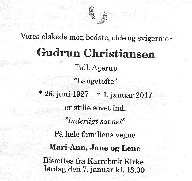 (A17). Gudrun Nielsen Gøgsig (f. 26. juni 1927 – d. 1. januar 2017) blev den 12. juni 1950 gift i Sørig Kirke med Jens Jørgen Christiansen (f. 13. juni 1924 – d. 13. december 1982).