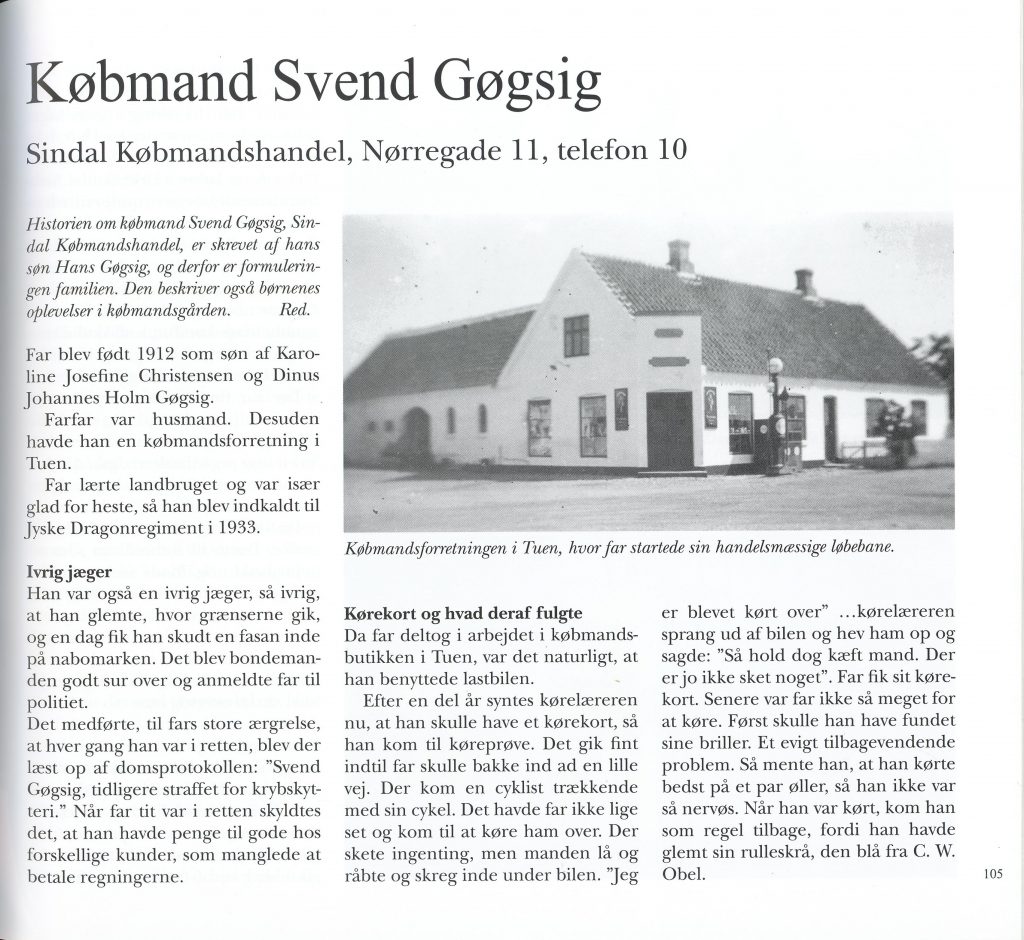 Mads fik jeg straks mere glæde af. Alders forskellen var kun 5 år, så i weekenden gik jeg ind til ham og tæskede løs på ham Han slog selvfølgelig tilbage, så Gleerup, min idrætslærer fik et mindre chok, da han så de blå mærker. Havde i det hele taget en fantastisk barndom. Voksede op i en slikbutik og en bar. Far var jo Købmand. Interesserede må ty til bogen:” Vore rødder 2015”, med artiklen ”Købmand Svend Gøgsig – Sindal Købmandshandel”, hvor jeg nærmere beskriver Foskanerne, Teatervirksomhed/Spøgelseshus og Indianere og boldspil i gården. Jeg blev flyttet til øverste etage, da far lavede bad og køkkenet om. Far blev træt af at åbne døren for mine kammerater om aftenen når han så tv, så jeg monterede en udendørs ringklokke, og kylede så nøglerne ned til gæsterne, med ordre om, hvor mange øl der skulle medbringes ovenpå. I den periode så jeg meget til Mads.