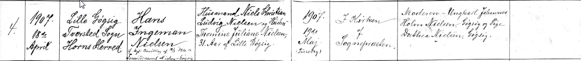 Hans Ingeman Nielsen-Gøgsig blev født i Tversted sogn Horns Herred på gården ”Lille Gøgsig” d. 18. April 1007. Hanses fødsel og dåb er registreret i kirkebogen i Sørig Sogn, Hjørring amt. Ifølge kgl. Bevilling af 18/3 1920 er familienavnet Nielsen – Gøgsig.