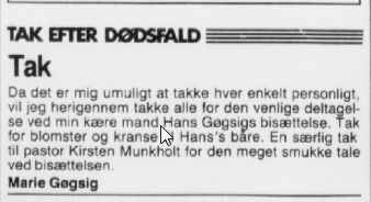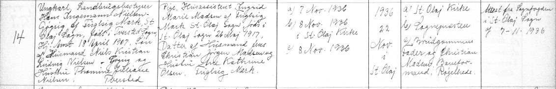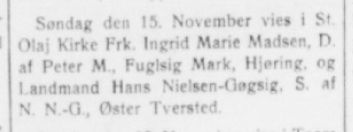 (A05). Hans Ingeman Nielsen-Gøgsig (f. 18. april 1907 – d. 1. maj 1991) blev Søndag den 22. november 1936 gift i Sct. Olai Kirke med Ingrid Marie Madsen (f. 26. maj 1917 – d. 6. april 2011).