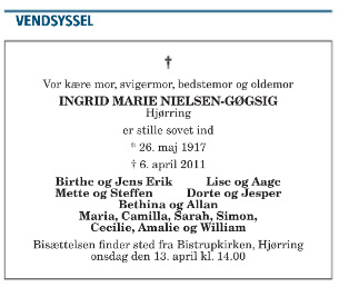 Ingrid Marie Nielsen-Gøgsig døde den 6. april 2011 i Hjørring. Hun blev 94 år. Begravelsen fandt sted fra Bistrup kirke. De ligger begge begravet på Sct. Olai kirkegård i Hjørring.