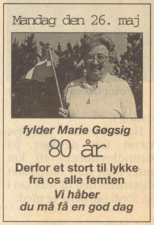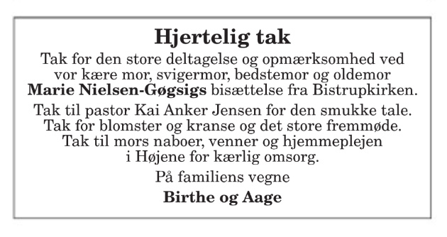 Birthe Nielsen-Gøgsig (f. 5. februar 1946 –) gift med Jens Erik Nielsen (f. 26. marts 1944).