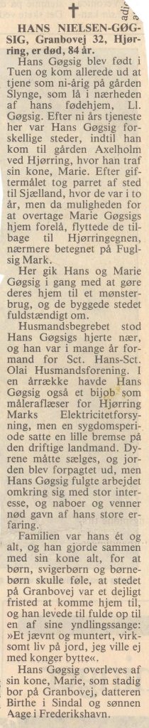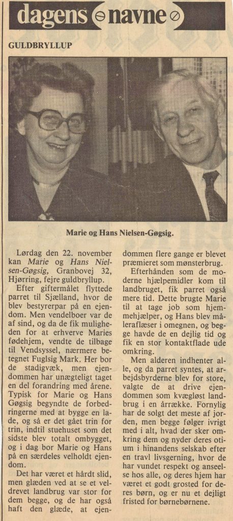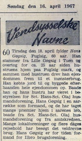 På de jyske husmænds sendemandsmøde i Aarhus september 1956 blev tre dygtige husmænd tildelt præmie for mønsterbrug. Hans Nielsen Gøgsig og hustru Marie Gøgsig Fuglsig mark var blandt vinderne med 12,89 points. De to øvrige fik henholdsvis 12,73 og 12,68 points. Arrangementet og vinderne blev omtalt i Thisted Dagblad, Vendsyssel Tidende og Løgstør Avis.
