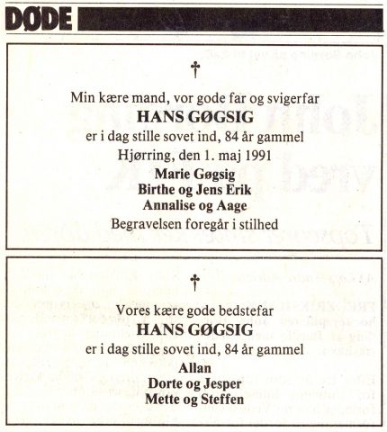 Hans Nielsen-Gøgsig døde den 1. maj 1991 i Hjørring, og blev begravet på Sct. Olai Kirkegård. Han blev 84 år.