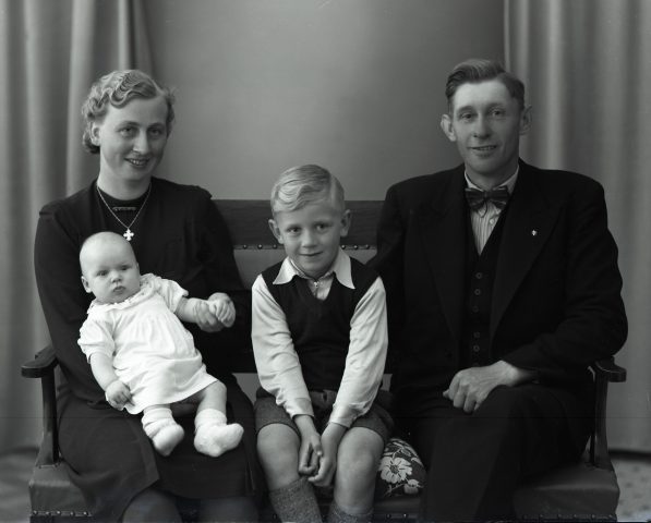 Marie, Birthe (barnedåb), Niels Aage og Hans Gøgsig, Fuglsig Mark hos fotograf Franz Christensen i Hjørring den 20. april 1946.