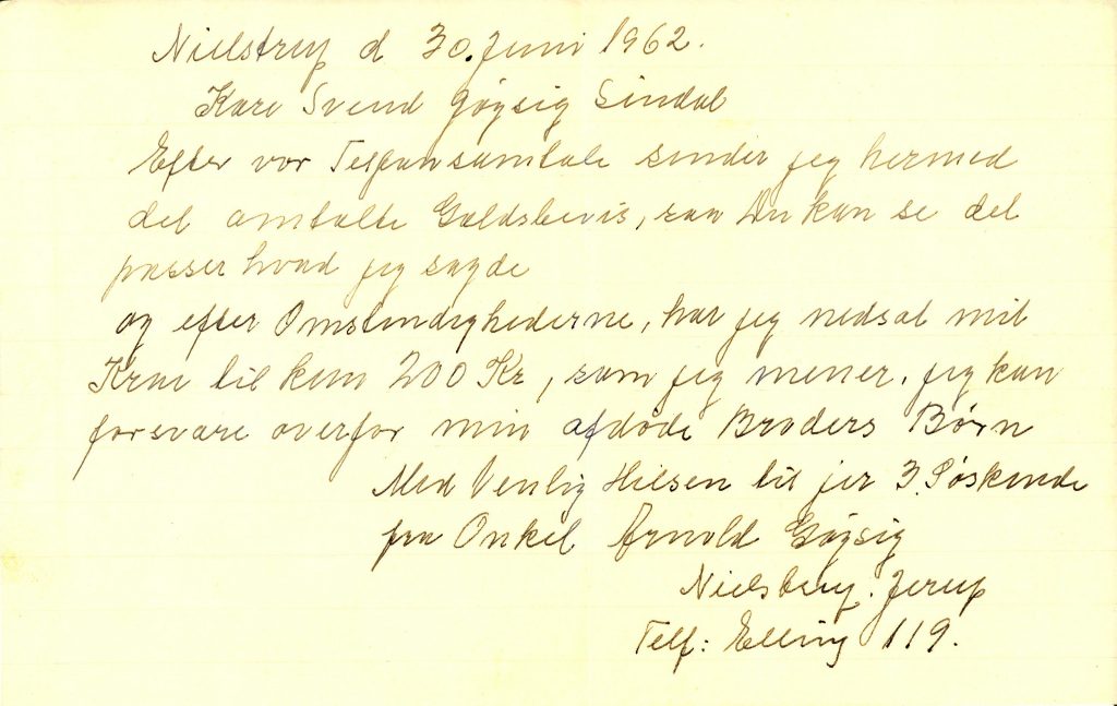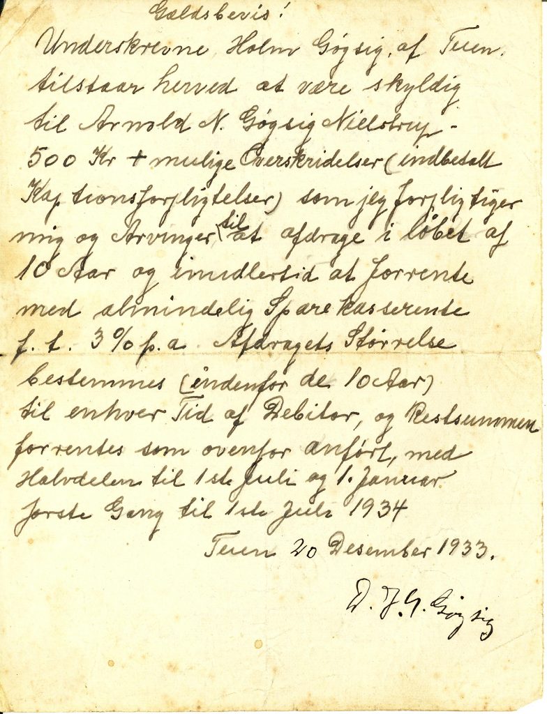 Den 30 juni 1962 modtog Svend Gøgsig et brev fra Onkel Arnold i Nielstrup, Jerup. Brevet indeholdt et gammelt gældsbrev udstedt den 20. december 1933 af Dinus Johannes Holm Gøgsig til Arnold Gøgsig Nielsen Nielstrup.