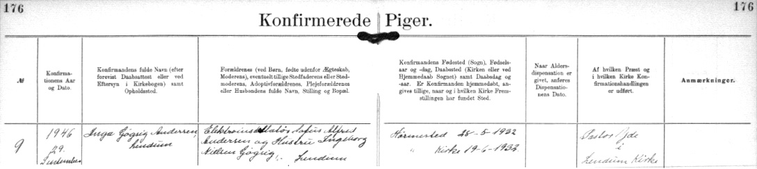 Inga blev konfirmeret 1946-09-29 i Lendum.