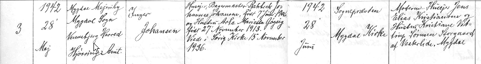 Bedsteforældrene Karoline og Holm Gøgsig var med til Ingers barnedåb d. 28. juni 1942. De cyklede fra Tuen til Mygdal. Der var stille, varmt og gråligt vejr. I dåbsgave gav de Inger en Sparebøsse og en bankbog med 5 kr. I dagens anledning blev der taget et samlet foto af gæsterne. Det er sikkert det sidste foto der blev taget af Holm. Han dør ca. 3 måneder senere d. 6. september 1942.