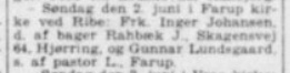 I København træffer Inger kommunebogholder Gunner Lundsgaard. Han er født den 7. juni 1939 i Thisted, Hassing, Thy. Forældrene er Gudrun Michelsen (1911-) og Bernhard Sørensen Lundsgaard (1909-). Inger og Gunner bliver gift søndag den 2. juni 1963 i Farup kirke ved Ribe. De får en lejlighed i Skanderborg.