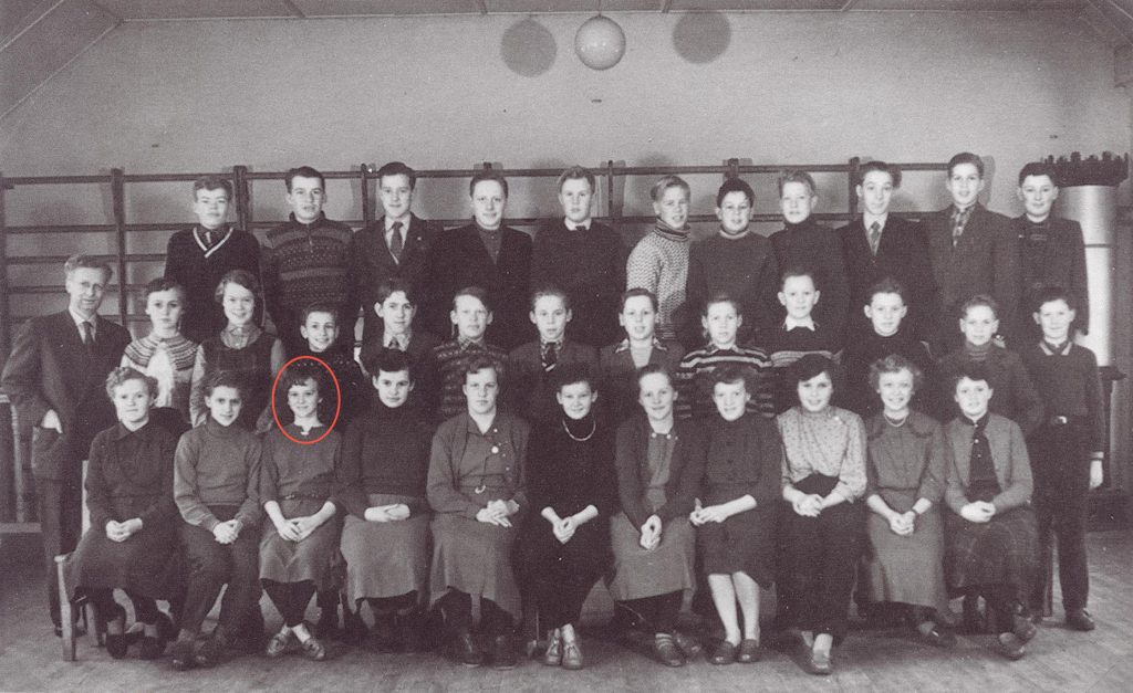 Medens de boede i Tversted, gik Inger til konfirmations forberedelse i Uggerby (foto fra gymnastiksalen) men hun blev konfirmeret i Tversted kirke d. xx. xxxx 1956.