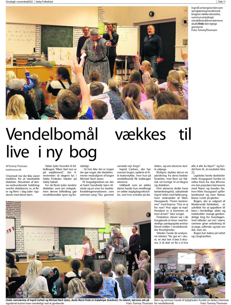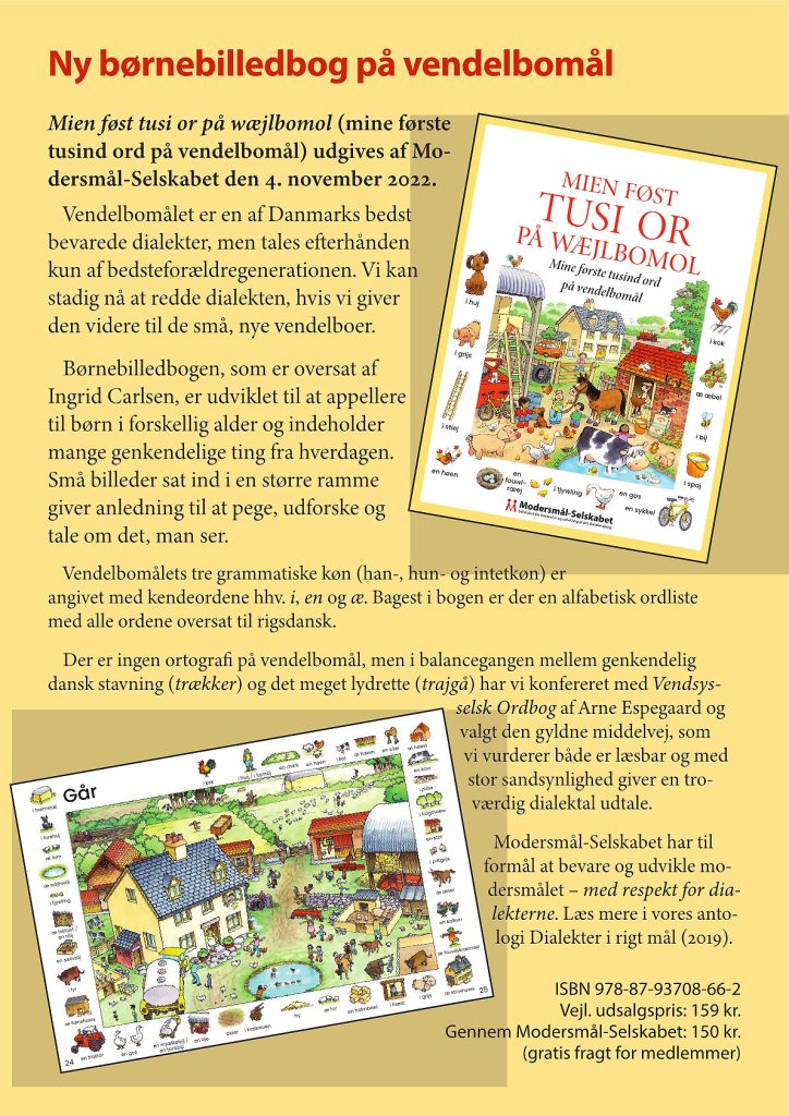 Modersmål-Selskabet udgav den 4. november 2022 en børnebilledbog på vendelbomål med titlen ”Mien føst tusi or på Wæjlbomol”. Vendelbomål er en af Danmarks bedst bevarede dialekter, men tales efterhånden kun af bedsteforældregenerationen. Børnebilledbogen er oversat af Ingrid Carlsen. Billedordbogen blev først præsenteret på Sæby Friskole, derefter på Hjørring Bibliotek, Vendsyssel-Gildet, i Radioen DR P1, i Go´morgen Danmark TV2, og på Ordkraft i Aalborg. De første to oplag på henholdsvis 1.000 og 2.000 bøger blev hurtigt udsolgt. Et nyt oplæg på 4.000 bøger er på vej fra trykkeriet.