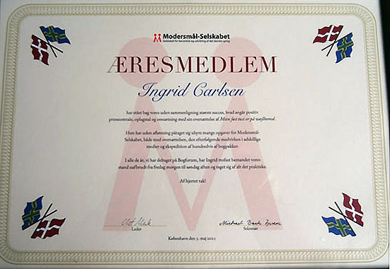 Ved Modersmål-Selskabets generalforsamlingen d. 3. maj 2023 blev Ingrid Carlsen udnævnt som æresmedlem.