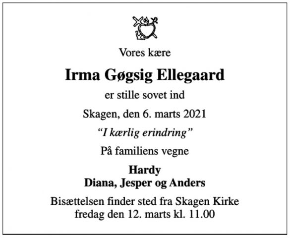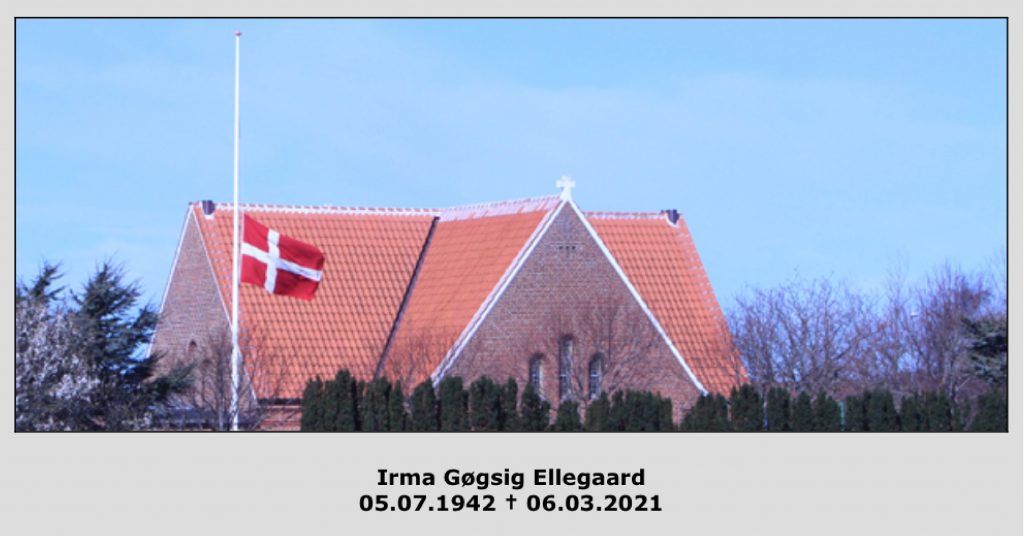 (A16). Irma Gøgsig Andersen (f. 5. juli 1942 – d. 6. marts 2021) blev d. 2. december 1961 gift med Hardy Roland Ellegaard (f. 17 januar 1936 – d. 8. marts 2022).