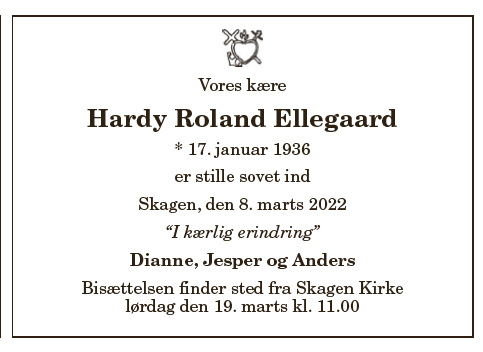Året efter døde Hardy i en alder af 85 år. Bisættelsen fandt sted fra Skagen Kirke. Hardys urne er nedsat på kirkegården i Gl. Skagen