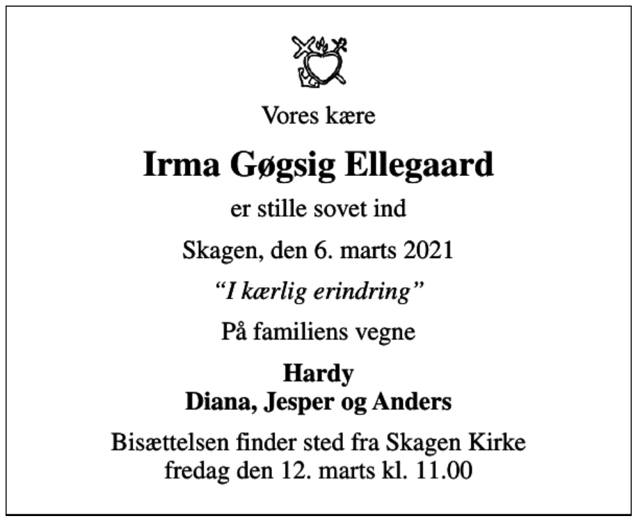 (A16). Irma Gøgsig Andersen (f. 5. juli 1942 – d. 6. marts 2021) blev d. 2. december 1961 gift med Hardy Roland Ellegaard (f. 17 januar 1936 – d. 8. marts 2022).
