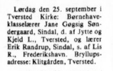 (L18). Jane Karin Gøgsig Søndergaard (f. 29. april 1955) gift lørdag d. 25. september 1982 med lærer Erik Randrup (f. 25. december 1951).