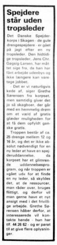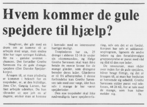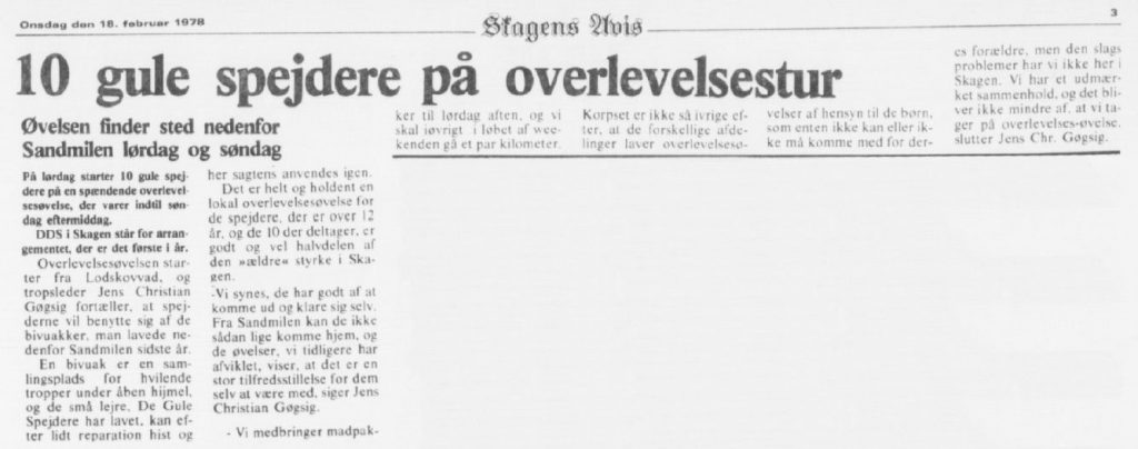 I februar måned 1978 tog 10 gule spejdere på en spændende overlevelsestur. Turen starter i Lodskovvad og de skal overnatte i bivuakker nedenfor Sandmilen. Det er Tropsleder Jens Christian der arrangerede turen. I 1982 fik Jens arbejde udenfor Skagen, og måtte derfor stoppe sit frivillige arbejde som tropsleder hos de gule spejdere DDS i Skagen.