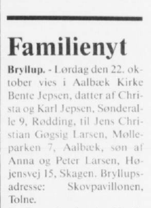 Hvor Jens traf Bente Jepsen, der er datter af Christa og Karl Jepsen, Sønderalle 9, Rødding vides ikke, men de blev gift lørdag den 22. oktober 1983 i Aalbæk kirke. Bryllupsfesten blev holdt i Skovpavillonen i Tolne.