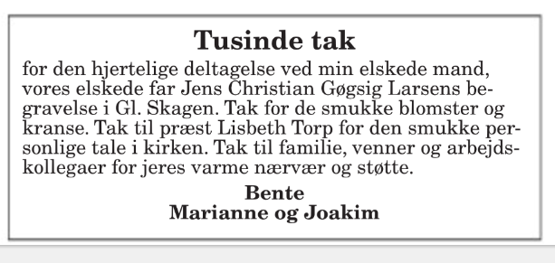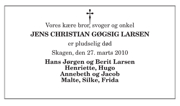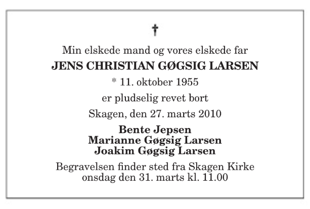 Jens Christian, der kun blev 54 år, blev begravet fra Skagen Kirke onsdag den 31. marts kl. 11.00, og gravsted er på Gl. Skagen kirkegård.