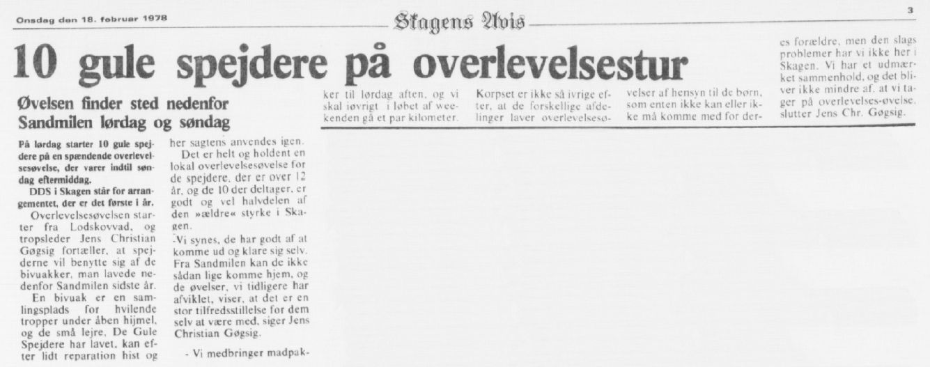 I februar måned 1978 tog 10 gule spejdere på en spændende overlevelsestur. Turen starter i Lodskovvad og de skal overnatte i bivuakker nedenfor Sandmilen. Det er Tropsleder Jens Christian der arrangerede turen. I 1982 fik Jens arbejde udenfor Skagen, og måtte derfor stoppe sit frivillige arbejde som tropsleder hos de gule spejdere DDS i Skagen.