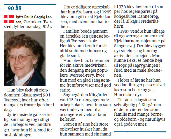 Jytte Paula Nielsen-Gøgsig blev født d. 28. 3. 1932 på hendes forældres gård i Østenkær, Tversted. Forældrene var Chr. og Valborg Gøgsig. Chr. Gøgsig købte gården i 1923.